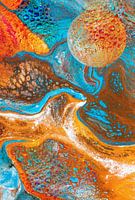 Abstracte kunst in blauw,turquoise en oranje tinten met bubbels en grove textuur