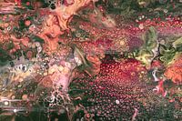 Abstract mixed media in paars, rood,oranje en groene tinten,met verf spetters,steen en bubbels. Flow fantasie kunst