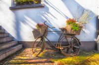 Oude verweerde fiets die op opgesierd met manden met waarin bloeiende planten. De foto is artistiek uitgevoerd door extra kleurcontrasten