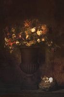 Stilleven met bloemen en een nest met eieren. de vogel bewaakt vanuit de bloemen haar eieren. stilleven dat past in iedere kamer door zijn ingetogen ,warme kleuren .