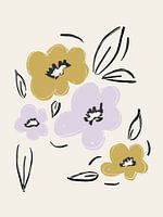 Abstracte schets van bloemen in oker geel en lila.