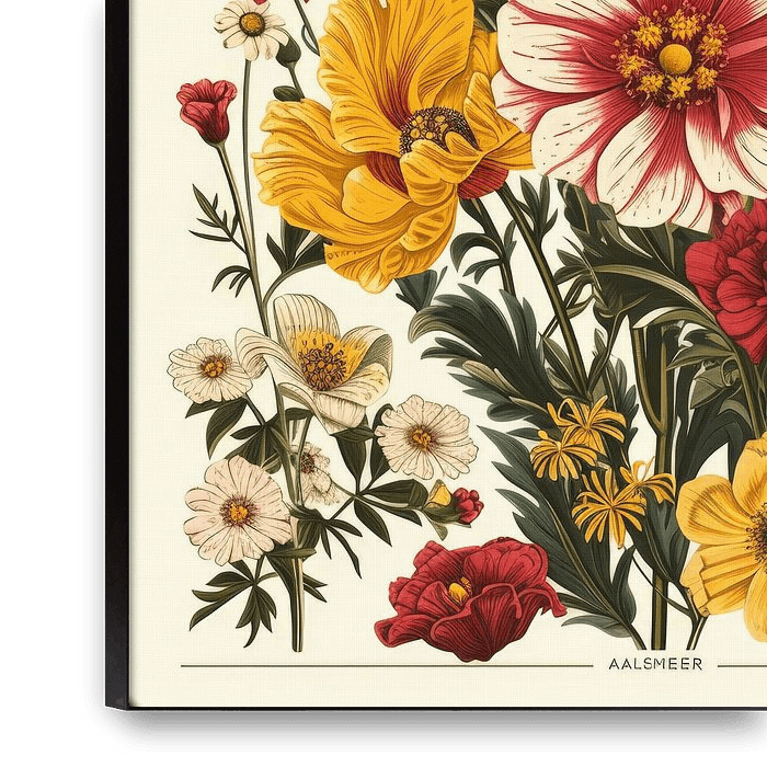 Dit trendy kunstwerk is een vintage-stijl poster met de titel 'Flower Market Aalsmeer', een eerbetoon aan een van de grootste bloemenmarkten ter wereld, gelegen in Nederland. De illustratie is rijkelijk gevuld met een verscheidenheid aan bloemen in warme en uitnodigende kleuren. Centraal staan grote, opvallende bloemen zoals een…