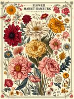 Dit trendy kunstwerk is een sierlijk vintage-stijl poster die een levendige verzameling bloemen afbeeldt, vermoedelijk geïnspireerd door de bloemenmarkt van Hamburg. Het toont een uitgebreid assortiment aan flora in diverse vormen en tinten, waaronder dieprode dahlia's, goudgele zonnebloemen, en zachte roze rozen. De bloemen zijn…