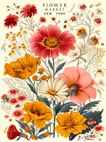 Dit trendy kunstwerk is een prachtige vintage-stijl bloemenposter die een florale markt in New York uitbeeldt. Het toont een verzameling van verschillende bloemen in warme en levendige kleuren, variërend van dieprood tot zachtgeel. Centraal op de poster staat een grote, roze bloem met een uitnodigende gele kern, omringd door rijk gele…