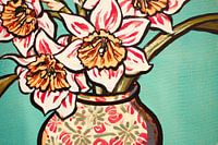 Flower Pop - Dit bloemen schilderij toont een kleurrijke vaas met opvallende witte en oranje bloemen op een levendige turquoise achtergrond, perfect voor een modern interieur.