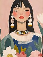 Een kleurrijk en modieus portret van een jonge vrouw met een stoere, eigentijdse uitstraling. Ze draagt opvallende geometrische oorbellen en een mozaïekachtige ketting, die de moderne kunstinvloeden in het werk benadrukken. Haar blik is zelfverzekerd en vastberaden, met felroze lippen die opvallen tegen haar zachte, roze achtergrond. Omringd door gestileerde bloemen, lijkt ze zowel deel uit te maken van de natuur als van een modecampagne. Dit werk straalt een speelse combinatie van haute couture en natuurlijke elegantie uit.