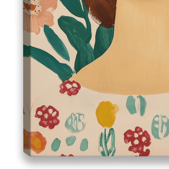 Dit kunstwerk toont een vrouw die duidelijk de zen-modus heeft bereikt waar we allemaal naar streven – ogen dicht, hoofd in de bloemen, alsof ze even een pauze neemt van de chaotische buitenwereld. Waarschijnlijk denkt ze: "Laat de to-do-lijst maar even wachten, ik ben nu een bloem." Met haar perfect getekende wenkbrauwen en lippen die…