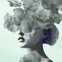 Portret van een prachtige vrouw met haar hoofd in de bloemen. Vol van gedachten en overpeinzingen. Mooie kleurstelling in aqua, blauw, groen en grijs.