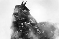 Prachtige arabische volbloed samengevoegd met witte bloemetjes uit de Veluwse natuur. Het beeld is in zwart wit voor een mooi contrast met de witte bloemetjes.