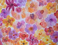 Op deze aquarel staat een mix van bestaande en fantasiebloemen. Het zijn echte zomerbloemen, dat zie je wel aan de vrolijke kleuren.