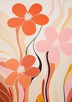 Een giclee kunstafdruk van bloemen, in de stijl van golvende lijnen en organische vormen, met lichtroze en oranje tinten. Het vertoont inheemse motieven en laat invloeden zien van Gary Hume, Australische landschappen, celvormige structuren, en een kleurenpalet geïnspireerd door aardetinten.