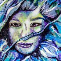 Dit is een schilderij met gebruik van de techniek collage. Met stukken papier heb ik structuur op het doek gebracht. Daarna heb ik een portret geschilderd in bloemachtige kleuren, zoals hyacinth en iris. Verscholen tussen de stengels en bloemblaadjes kijkt een elfje je aan.