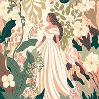 Op het schilderij een is vrouw te zien in een lange jurk die door haar bloementuin loopt. De pastelkleuren geven het een rustige sfeer. De stijl van het schilderij is Art Deco.