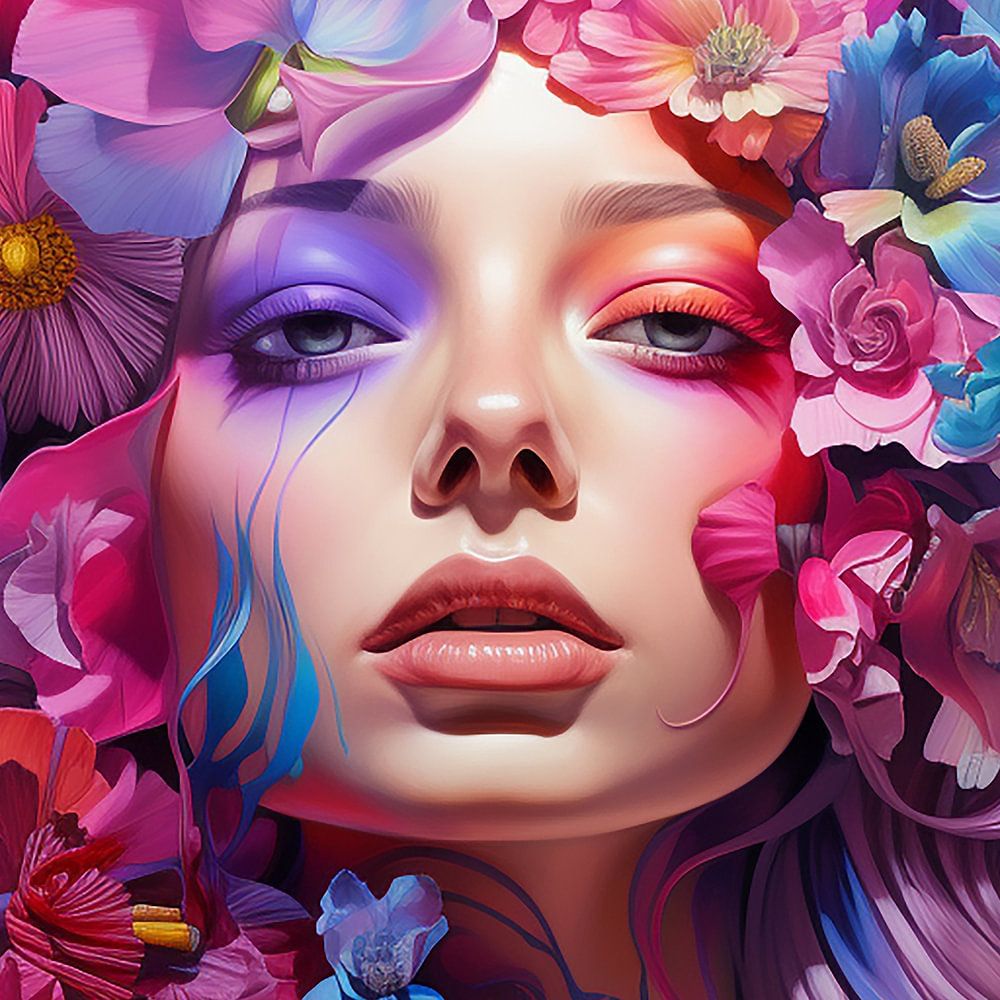 Een vrouw met kleurrijke make-up en bloemen op haar hoofd, in de stijl van realistische hypergedetailleerde weergave, creëert een vloeiend en losjes uitgevoerd beeld met een magenta ondertoon. Dit kunstwerk omvat realistische sculpturen en maakt gebruik van een helder kleurenpalet.