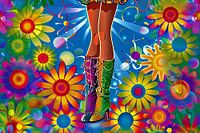 Flowerpower digitale fantasiewereld met fictieve personen in kleurrijke bewerkingen