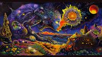 digitaal schilderachtig beeld in felle kleuren van fictieve personen met bloemen in een fantasiewereld