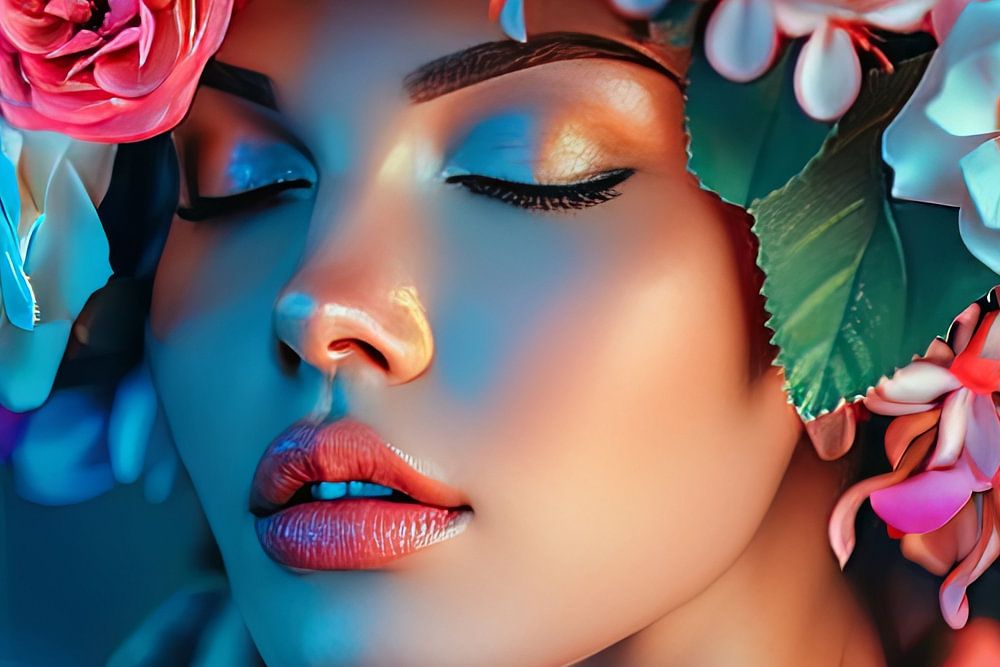 digitaal schilderachtig beeld in felle kleuren van fictieve personen met bloemen in een fantasiewereld