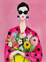 Deze elegante vrouw houdt niet van kleine statements. Met haar zonnebril, polkadot blouse en een uitbundig boeket laat ze zien wat écht prioriteit heeft. Een ode aan schoonheid, flair en het plezier van jezelf omringen met kleur.