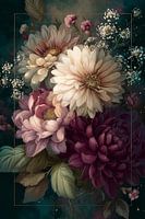 Een meeslepende illustratie die klassieke bloemenschilderkunst heruitvindt met eigentijdse verfijning. Volle rozen in crème en paars-bordeaux dansen samen met delicate gypsophila tegen een mystiek groene achtergrond, omlijst door gouden lijnen. Het werk combineert botanische elegantie met romantisch art-deco design, perfect voor wie…