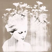 Prachtig portret van een vrouw met bloemen op de achtergrond. Het is fluitenkruid, een schermbloem. Mooie subtiele kleurstelling in zwartwit, grijs en beige. De mixed media techniek maakt het nog meer kunstzinnig. Passend bij diverse stijlen en trends. Naturel, botanisch. Sweet embrace. Bloemenveld.