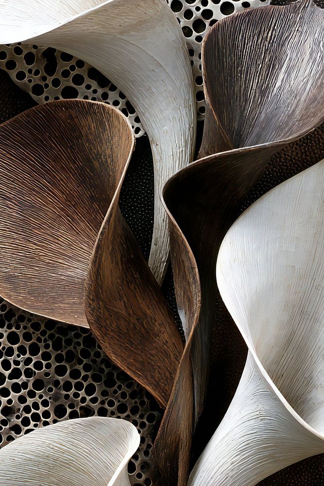 Abstract stilleven met bloemen in gebroken wit en bruin tinten met een grove steen en hout textuur.