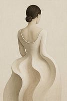 Flowing Ceramic Elegance’ is een visuele ode aan vorm, rust en verfijning. Deze minimalistisch-surrealistische compositie toont de rug van een vrouw, subtiel gehuld in een vloeiende, bijna sculpturale jurk die overgaat in golvende lijnen. Het werk balanceert op de grens van figuratief en abstract en roept de elegantie op van handgevormd keramiek of marmer — een harmonie van zachte textuur en krachtige esthetiek.