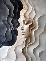 Abstracte figuratieve kunst met het profiel portret van een vrouw in vloeiende vormen en een ruwe textuur.