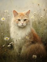 In dit schilderachtige beeld zit een prachtige, pluizige rode kat te midden van een zee van madeliefjes. Zijn dikke, zachte vacht contrasteert prachtig met de tere bloemetjes rondom hem, wat het geheel een dromerige en rustige sfeer geeft. De kat zit rechtop en kijkt met scherpe ogen recht naar de kijker, alsof hij elk moment zou kunnen…