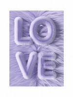 De letters van het woord 'love' staan pluizig en aaibaar op lila-kleurig nepbont.