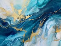 Vloeiende vlakverdeling in aqua, blauw, wit en goud.