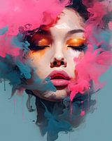 "Fluïde Dromen" is een portret dat de kijker meeneemt in een wereld waar kleur en zintuig samenvloeien tot een symfonie van synesthesie. De vrouw lijkt in een staat van zalige trance, haar ogen gesloten, omgeven door een dromerige waas van roze en blauwe tinten die overgaan in de suggestie van gewichtsloze beweging. De levendige kleuren…