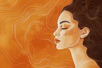 Dit kunstwerk vangt de kalme elegantie van een vrouwelijk profiel, omlijst door sierlijke, golvende lijnen die als een zachte bries lijken te dansen. De warme oranje en bruine tinten stralen een gevoel van rust en warmte uit, terwijl de fijne witte lijnen een luchtige beweging toevoegen. Het detail in de lijnen benadrukt de harmonie tussen vrouwelijkheid en natuur, perfect voor een interieur dat moderniteit en sereniteit combineert.