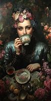 Het andere opvallende element is het porseleinen theekopje dat ze tegen haar lippen houdt: fijn beschilderd met kleine rozen, gouden lijnen en een fragiel oor dat met één hand wordt vastgehouden. Het theekopje is niet zomaar servies; het is een stille toneelspeler. Het porselein echoot het bloemmotief van de krans in haar haar en de bloemen op tafel, en creëert zo een ritme tussen gezicht en object. In dit schilderij is het theekopje zowel schild als spiegel: het verbergt een deel van haar gezicht en toont tegelijkertijd een zorgvuldig gekozen wereld van decoratie en traditie. Daardoor wordt het theemoment verheven tot een symbool — van etiquette, van klein genot, van een intiem ritueel.