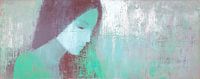 Fluister - Dit werk toont allereerst een ingetogen vrouwenprofiel — zij kijkt omlaag, het gezicht zacht en bijna doorzichtig tegen de achtergrond. De contouren van haar kaaklijn en neus zijn duidelijk, maar niet scherp; je ziet eerder een suggestie van een gezicht dan een voltooid portret. Het is een vrouw schilderij waarin de aandacht ligt op de stilte van haar pose: het hoofd licht gebogen, het haar als een donkere sluier die naar beneden valt. Het gezicht is bijna wit, met koelblauwe tonen die het tot een lichte, bijna etherische verschijning maken. Deze keuze benadrukt het fragiele karakter van het portret: minder een fysiek portret, meer een echo, een herinnering in verf.