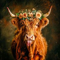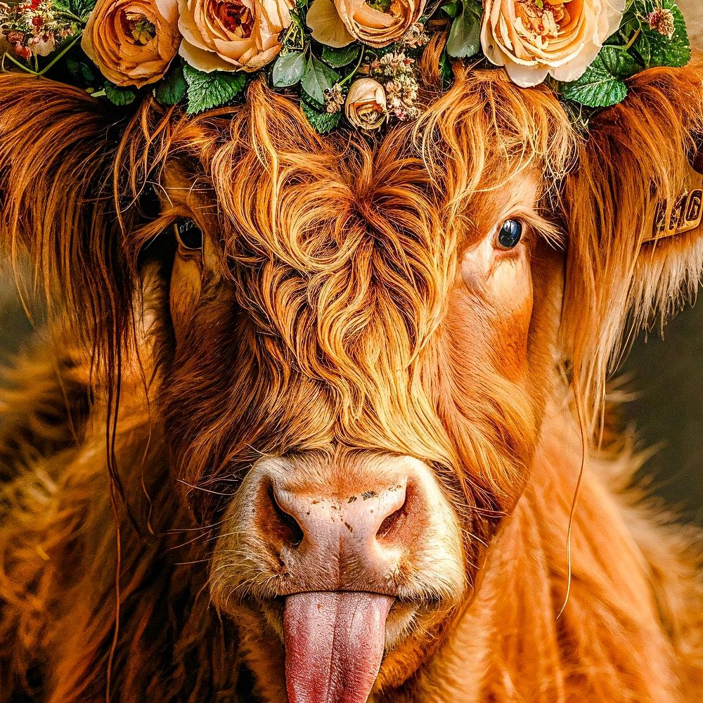 Het dier draagt trots een krans van pastelkleurige rozen waarvan de bloemblaadjes perfect samengaan met de heldere kleur van zijn vacht. De puntige en glanzende hoorns van het rund geven het een aura van waardigheid en kracht, terwijl de uitgestoken tong en zachte blik een moment van sereniteit en scherts vangen.