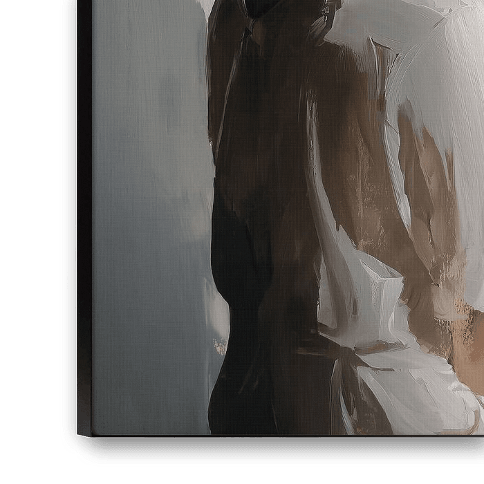 De figuur staat half afgekeerd, alsof ze luistert naar iets dat alleen zij kan horen. Haar houding is ingetogen, rustend in een overgang tussen waken en dromen. Het licht dat langs haar gezicht strijkt, vangt subtiele details: een lok die losgeraakt is, de zachte ronding van haar wangen, de bijna verstilde ademhaling. Deze aanraking door het licht is geen fel contrast, maar een fluïde overgang die de grens tussen lichaam en omgeving verzacht.