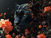 Deze intrigerende afbeelding toont een mysterieuze zwarte panter wiens vacht lijkt te versmelten met de duisternis van de omgeving, terwijl hij omgeven wordt door een delicate bloemenpracht. De subtiele tinten van de bloemen variëren van zachte perzik tot dieporanje, die een levendig contrast vormen met het diepe zwart van de panter. De…