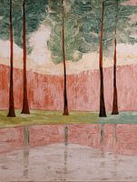 Hoge bomen staan sierlijk bij een spiegelende vijver, hun vormen verzacht door warme tinten roze en groen. Een sereen tafereel van balans en harmonie