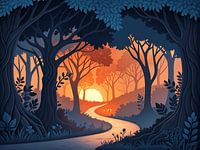 Terwijl de zon onder de horizon zakt en de hemel schildert in warme oranje en gouden tinten, slingert een rustig pad zich door een sereen bos. Silhouet bomen staan als oude schildwachten, hun ingewikkelde takken reiken naar het vervagende licht. De lucht is stil, gevuld met de belofte van de schemering en het subtiele geritsel van bladeren. Deze scène roept een gevoel van vrede op en nodigt uit tot contemplatie te midden van de stille schoonheid van de natuur's omhelzing.