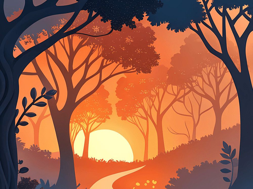 Terwijl de zon onder de horizon zakt en de hemel schildert in warme oranje en gouden tinten, slingert een rustig pad zich door een sereen bos. Silhouet bomen staan als oude schildwachten, hun ingewikkelde takken reiken naar het vervagende licht. De lucht is stil, gevuld met de belofte van de schemering en het subtiele geritsel van bladeren. Deze scène roept een gevoel van vrede op en nodigt uit tot contemplatie te midden van de stille schoonheid van de natuur's omhelzing.