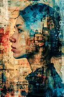 De foto toont een vrouw in profiel, haar gelaatstrekken verweven in een dicht stedelijk tafereel. Haar peinzende blik is gericht op een onzichtbare afstand, terwijl achter haar gebouwen en straten verschijnen die getuigen van beweging en leven. De kleuren - een mix van warme aardetinten en koele blauwtinten - creëren een gespannen contrast dat de overgang tussen de binnen- en buitenwereld weerspiegelt.