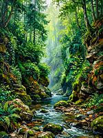 Dit impasto-schilderij, geïnspireerd door de ongerepte wildernis van de Wutach-kloof, toont een afgelegen rivier die zich een weg baant door een dicht bos. De rijke texturen en het zachte licht roepen een gevoel van rust, mysterie en de stille diepte van de natuur op.