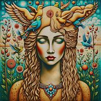 Het figuratieve schilderij toont een serene vrouw in een symbolisch portret, haar ogen zachtjes gesloten in stille introspectie. Deze visuele symboliek (kunst) suggereert een terugtrekking uit de externe chaos van de wereld, nodigt ons uit om naar binnen te kijken en ons diep te verbinden met het ritme van de natuur en de ziel. Om haar heen glijden tere vogels moeiteloos door het tafereel. Hun vrijheid roept het grenzeloze potentieel van de menselijke geest op om boven de beperkingen van het leven uit te stijgen.