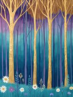 Whispers of the Golden Grove" is een fascinerend digitaal schilderij dat de kijker meeneemt naar een betoverend bos. Het kunstwerk bestaat uit een gestileerde afbeelding van hoge, slanke bomen met gouden schors, waarvan de bladerloze takken naar de bovenkant van het frame reiken. Deze bomen domineren de compositie en creëren een…