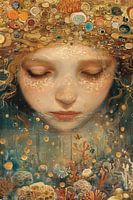 Deze afbeelding, getiteld "Fluisteringen van de Oceaan", toont een jong meisje ondergedompeld in de wonderen van de zee, haar haren en gedachten verstrengeld met de rijkdom van het onderwaterleven. De veelheid aan kleuren en patronen die haar kroon vormen, spreekt van de rijke biodiversiteit en de delicate verbinding die wij als mensen met de oceaan hebben. Dit werk biedt een serene toevoeging aan elke ruimte, een stilte te midden van de chaos, en nodigt de toeschouwer uit tot een moment van reflectie over de schoonheid en het belang van onze oceanen. Het vormt een uitnodiging tot bescherming en bewondering van de natuurlijke wereld onder water.