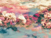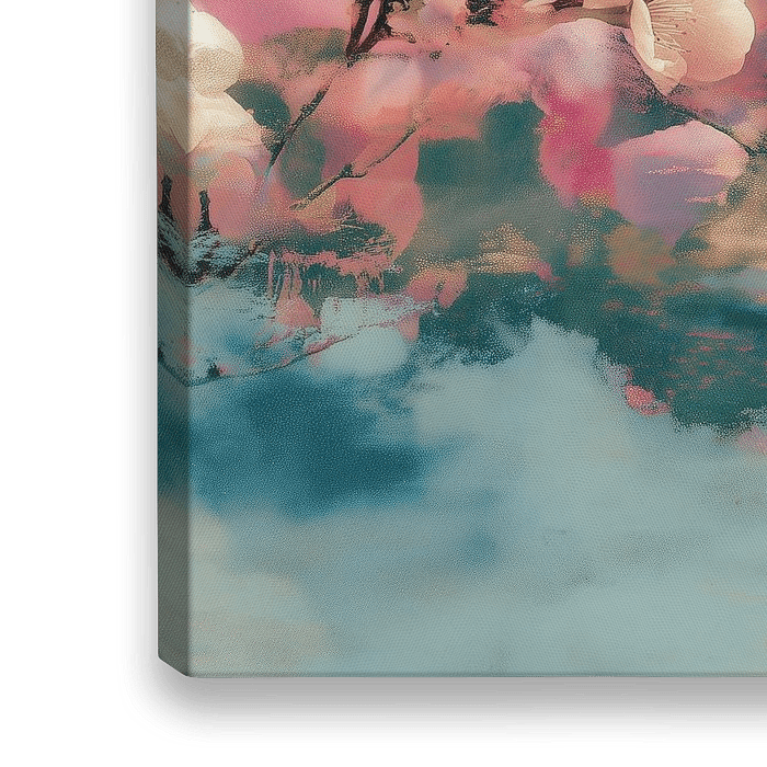 Een dromerig, etherisch kunstwerk dat delicate kersenbloesems mengt met een op aquarel geïnspireerde lucht. De zachte pasteltinten en vloeiende overgangen tussen roze, blauw en goud roepen een gevoel van sereniteit en vluchtige schoonheid op.