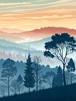 Dit digitale schilderij roept een sereen en sfeervol landschap op bij zonsopgang of zonsondergang. Lagen van mistige heuvels vervagen naar de horizon, geschilderd in zachte tinten blauw, groen en gedempt oranje. Op de voorgrond staan silhouetten van bomen in verschillende vormen en maten. Hun donkere vormen steken af tegen de lichtere, wazige achtergrond. Het algemene effect is er een van rust en de uitgestrektheid van de natuur.