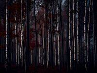 Een spookachtig mooi beeld van een dicht berkenbos in de late herfst. De spierwitte stammen van de berkenbomen staan in scherp contrast met de diepe schaduwen en de paar karmozijnrode bladeren die nog aan de takken hangen. De scène roept een gevoel op van stille eenzaamheid en de melancholische schoonheid van de veranderende seizoenen.