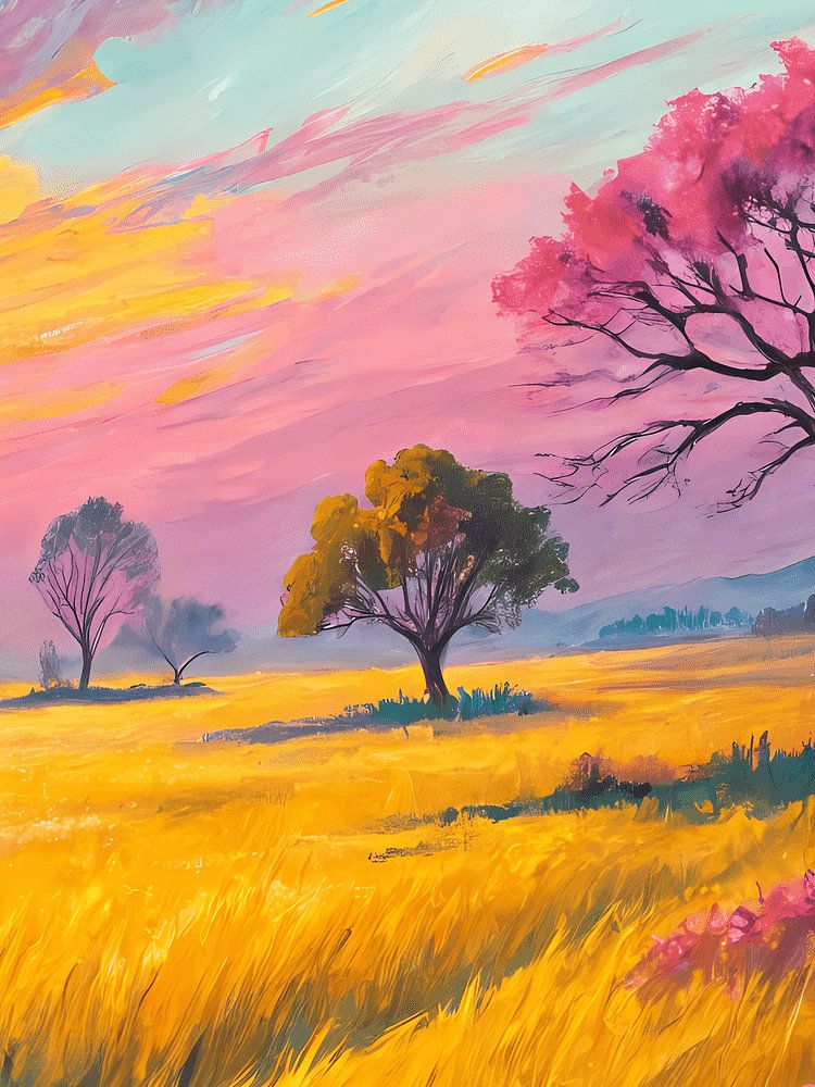 Een levendig schilderij van een sereen landschap in de schemering. Goudkleurige velden met hoog gras wiegen zachtjes onder een hemel die schittert in turquoise, roze en gele tinten. Silhouet bomen stippelen de horizon uit, met een prominente boom op de voorgrond versierd met opvallende magenta bloesems, waardoor een brandpunt van kleur en leven ontstaat tegen de warme tinten van de ondergaande zon.