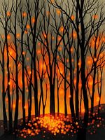 Een gestileerde weergave van een dicht bos in de schemering, waar de donkere silhouetten van kale bomen tegen een warme, gloeiende achtergrond staan. Wervelingen van oranje en geel licht, die doen denken aan vuurvliegjes of sintels, dansen door de scène en verlichten de gevallen bladeren die over de grond verspreid liggen. Het contrast…